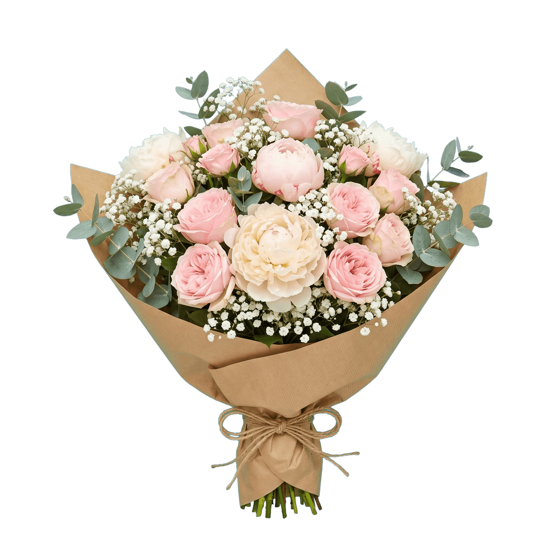 Peonies in season, soft pinks, baby's breath, eucalyptus. The proper birthday bouquet · the one that gets a photo on Instagram.