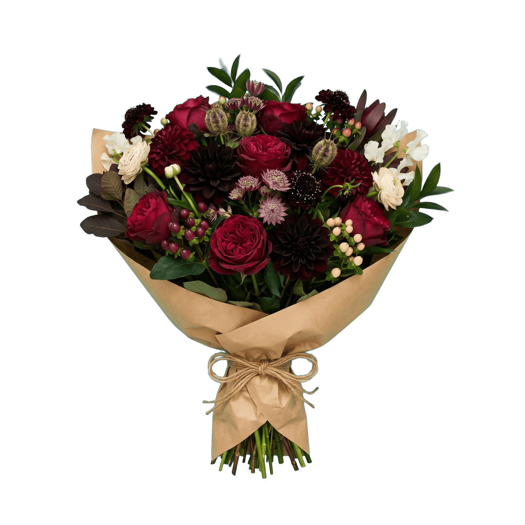 Deep reds, structural foliage, two-handed carry. For a milestone birthday, or someone who needs to be told they matter.
